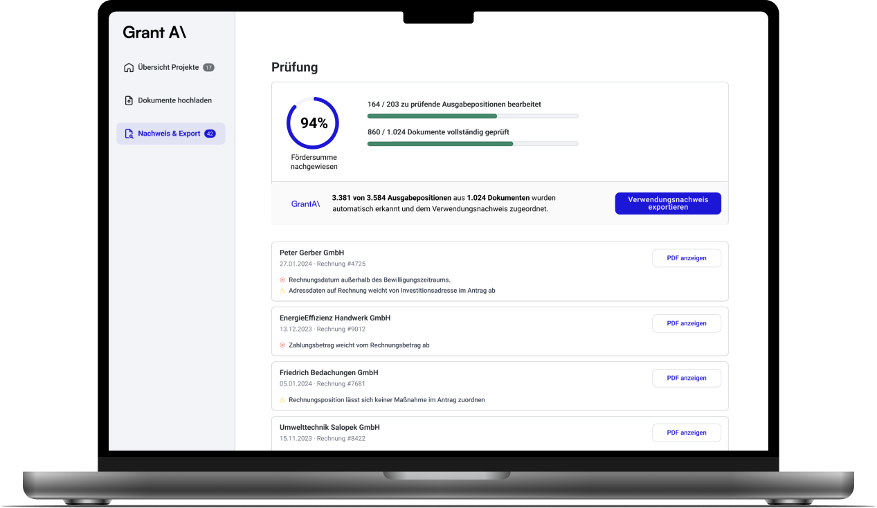 3. Bewilligung erhalten, Förderung geltend machen. Ist der Antrag genehmigt, bereitet grant.AI die erforderlichen Nachweise automatisiert auf – konform den GoBD (Grundsätze zur ordnungsmäßigen Führung und Aufbewahrung von Büchern, Aufzeichnungen und Unterlagen in elektronischer Form sowie zum Datenzugriff), steuerlich nachvollziehbar, direkt verwendbar für die Einreichung beim Finanzamt oder bei der Förderstelle. Die Integration in bestehende Prozesse funktioniert reibungslos – ohne zusätzliche Tools, ohne Systemwechsel.